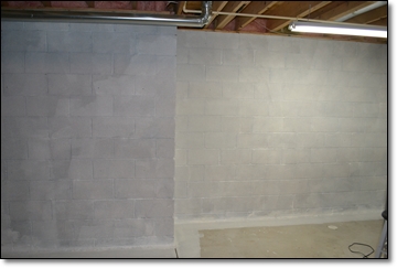 At left, Basements wall with 2 coats of Hydro-Seal 75 applied. At right, after application of Hydro-Seal 75 1st coat, Hydro-Seal 75 penetrates the surface for a great waterproof bond to the walls.